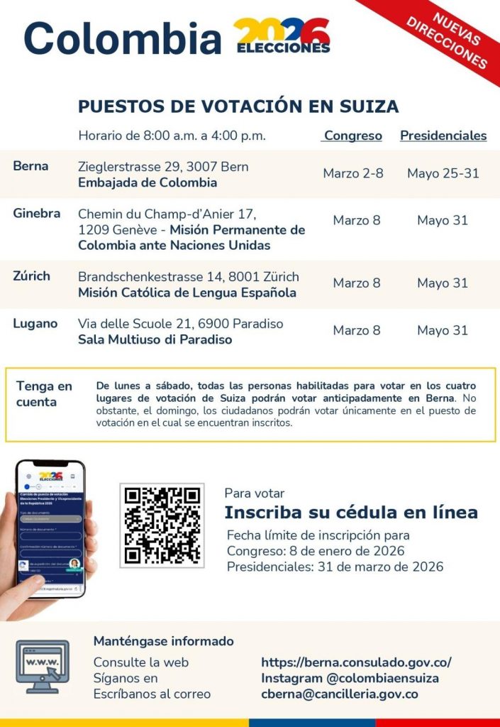 En el marco de las Elecciones Colombia 2026, compartimos la información oficial sobre los puestos de votación habilitados en Suiza, junto con fechas, horarios y datos importantes para que los colombianos en el exterior puedan ejercer su derecho al voto de manera informada y oportuna. Tu participación fortalece la democracia.