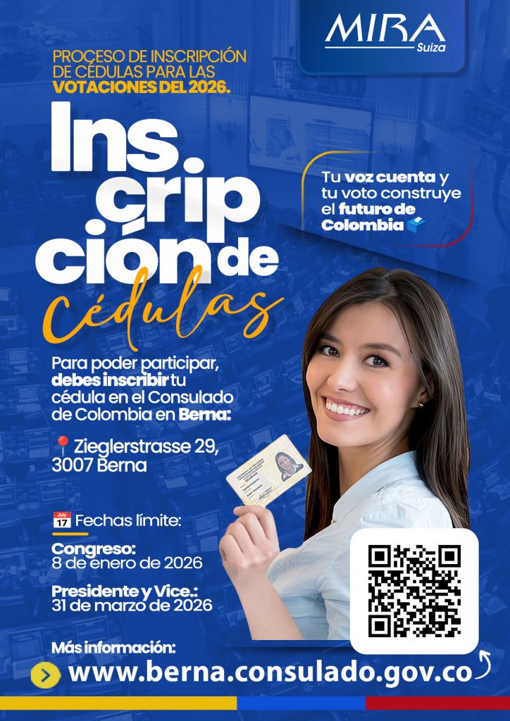 La Asociación MIRA Suiza Internacional invita a todos los colombianos residentes en Suiza a participar activamente en las elecciones de 2026 en Colombia. Para poder ejercer este derecho ciudadano, es indispensable que tu cédula de ciudadanía esté inscrita en el Consulado de Colombia en Berna.