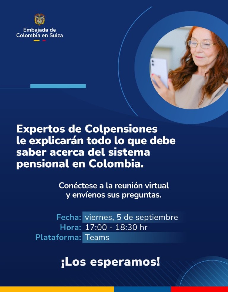 La Asociación MIRA Suiza Internacional invita cordialmente a toda la Comunidad Colombiana residente en Suiza a participar en una sesión informativa sobre pensiones, un espacio diseñado para aclarar dudas, resolver inquietudes y brindar orientación sobre este tema de gran importancia para nuestro futuro y el de nuestras familias.